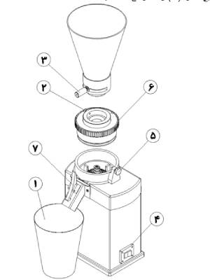 - جهت تنظیم اندازه پودر قهوه ، ابتدا پیچ شماره (۵ ) را شل نموده وسپس با چرخاندن صفحه مدرج، به سمت چپ ویا راست (۶)، اندازه ریزی و یا درشتی پودر قهوه را انتخاب نموده و پیچ (۵ ) را ببندید